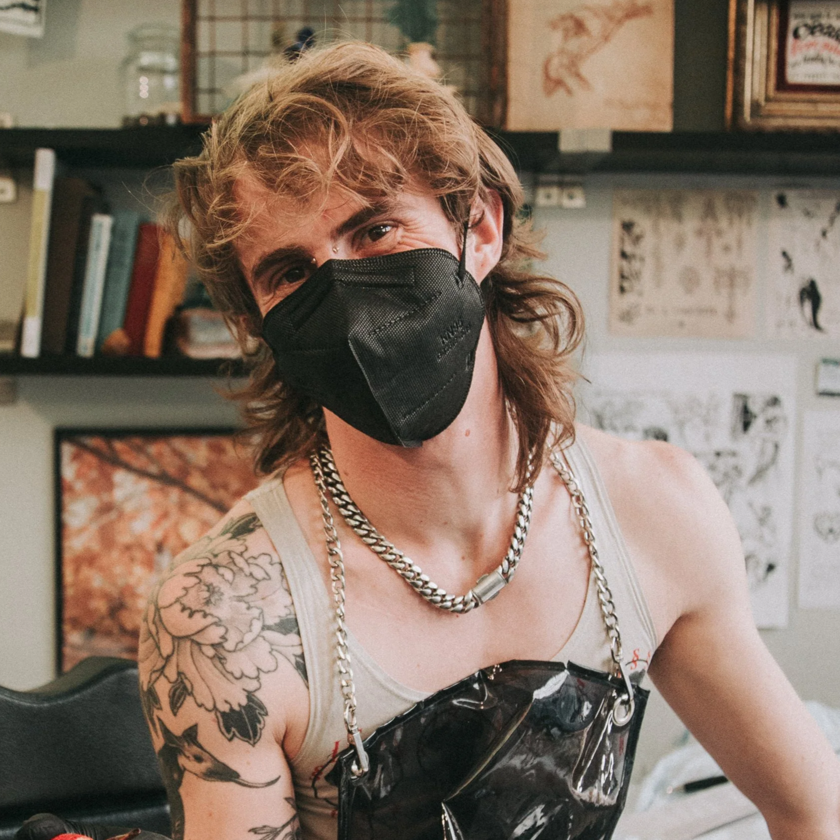 He also offers the following styles: color, fine-line, illustration reproduction, black work and realism. He prioritizes tattoos with the following subject matter: plants, animals, insects, skulls, children’s book illustrations, architecture, and queer and transgender themes.